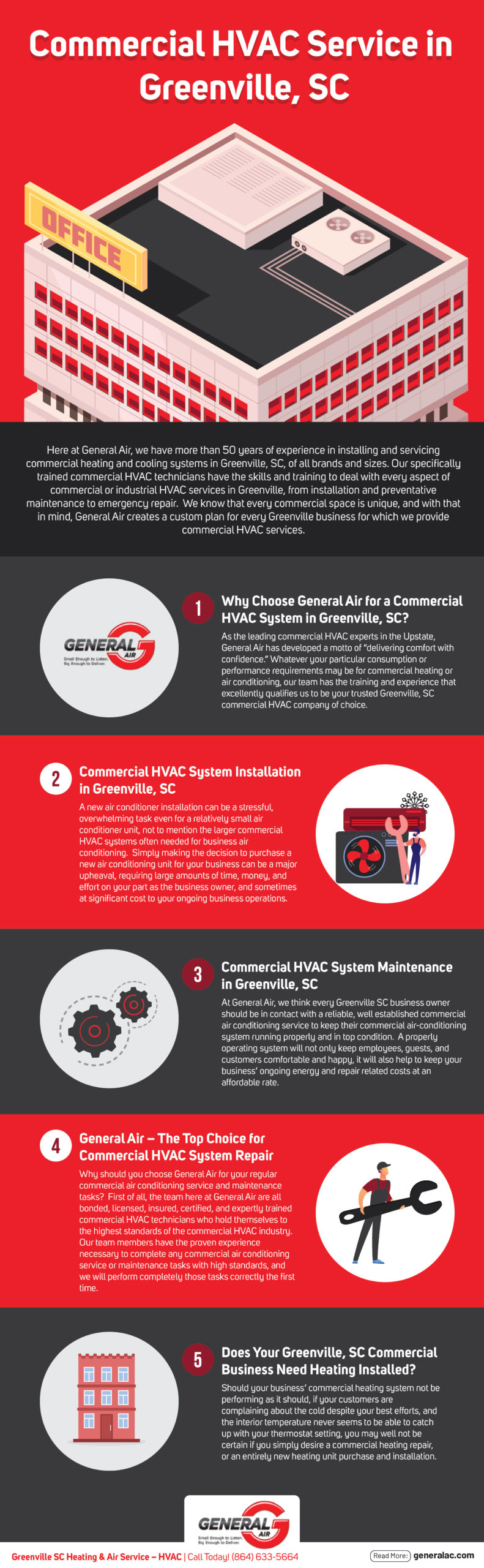 Contact us at 864-633-5664 to speak to our professional, friendly staff and learn more about General Air’s commercial AC installation service in Greenville, SC. We offer emergency HVAC service 24 hours a day, 7 days a week. You can also visit us at 5409 Augusta Road, Greenville, SC 29605.